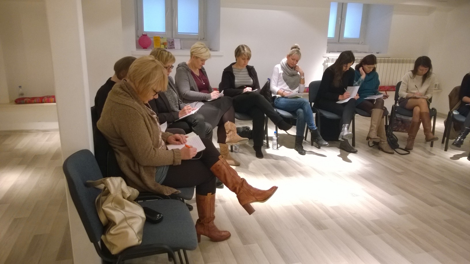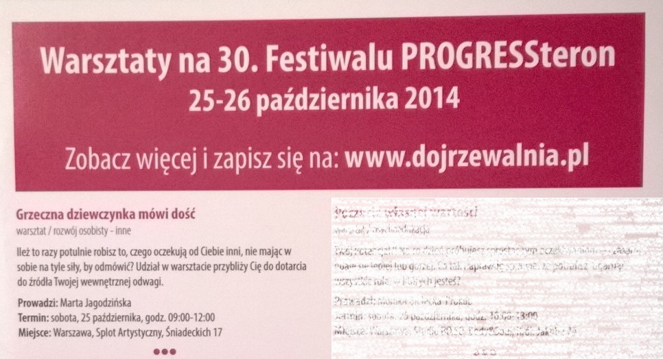Warsztat „Grzeczna dziewczynka mówi DOŚĆ” prowadzony w ramach XXX edycji Festiwalu Progressteron, organizowanego przez Dojrzewalnię Róż – 10.2014 r.