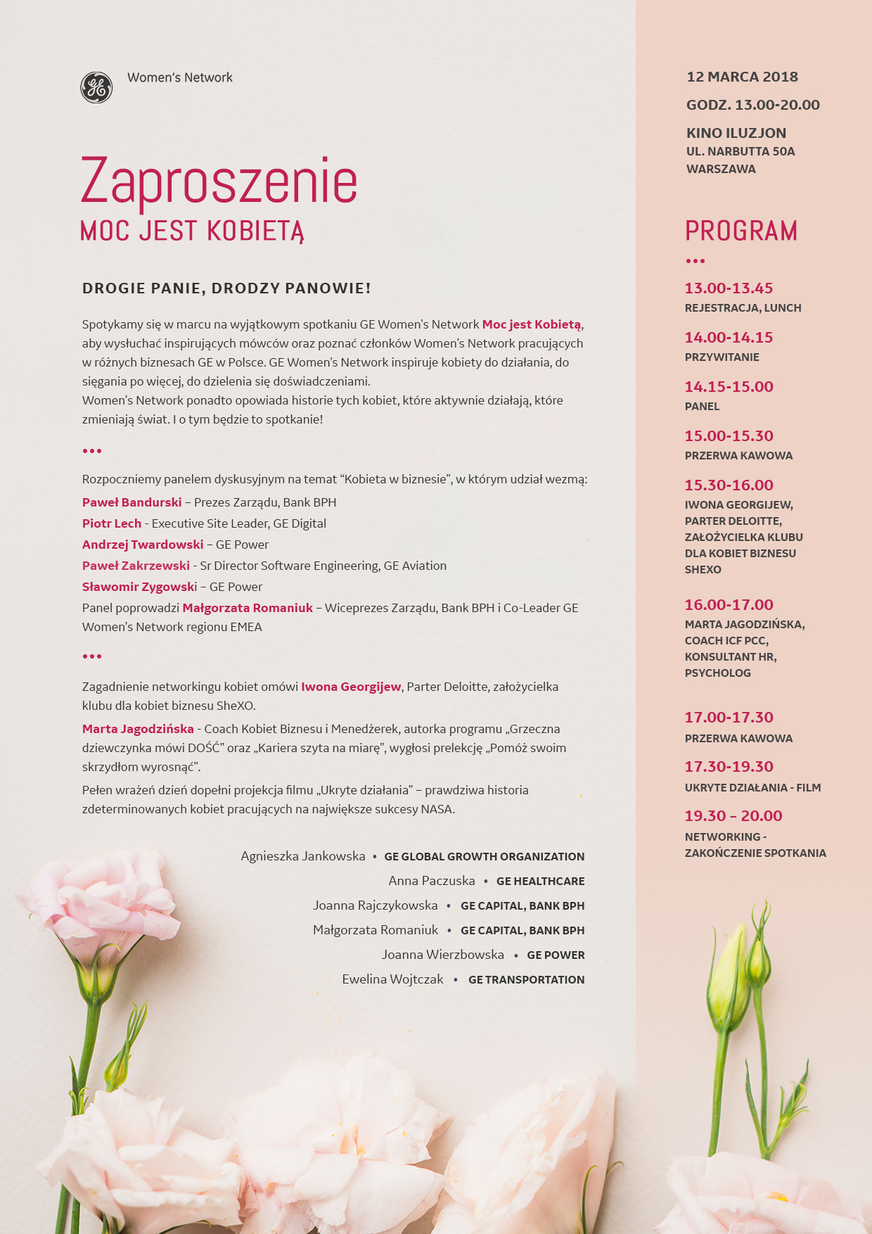 Prelekcja „Pomóż swoim skrzydłom wyrosnąć” prowadzona w ramach spotkania „Moc jest kobietą”, organizowanego przez GE Women’s Network 12.03.2018 r.