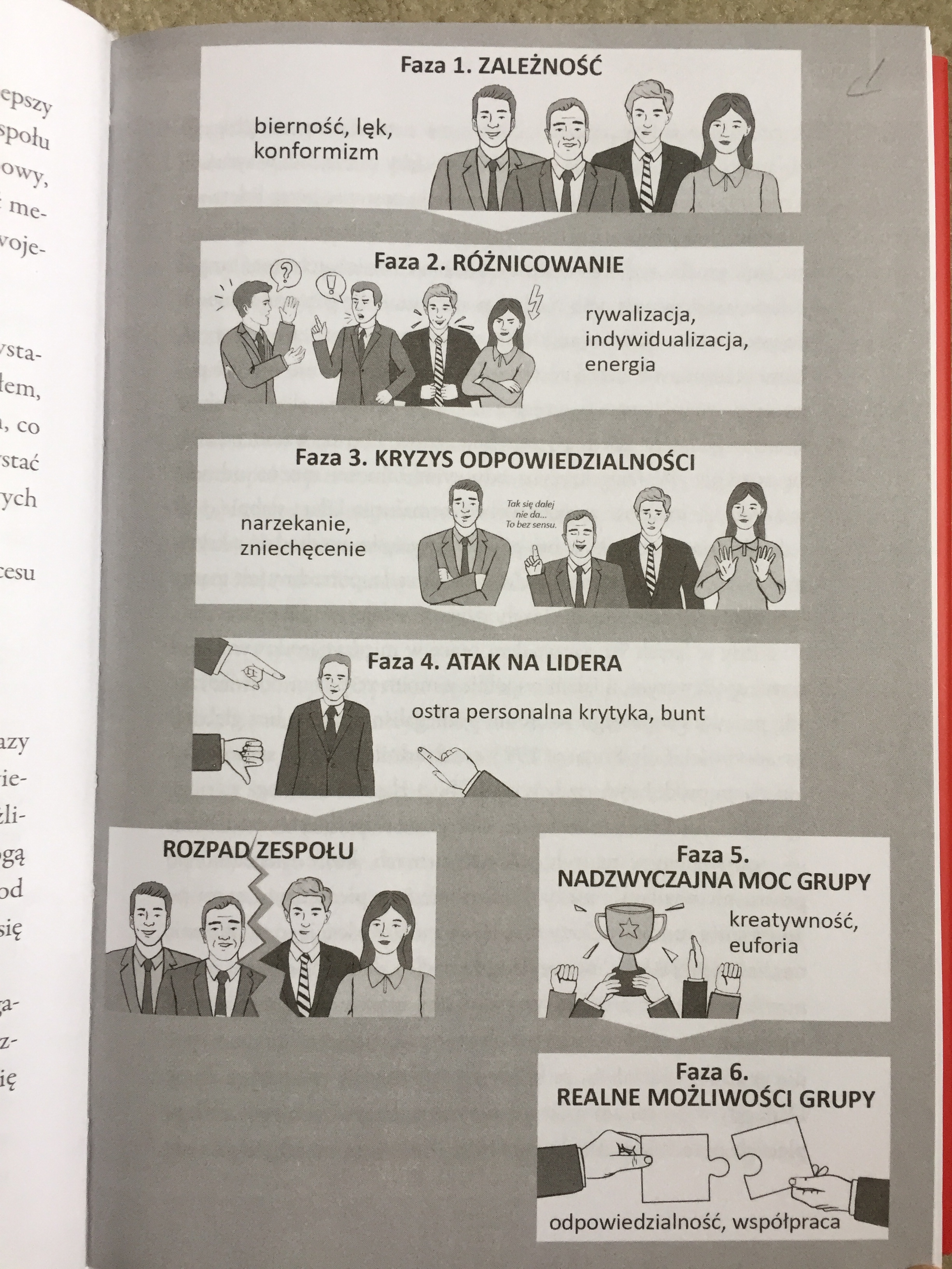 Druga część tytułu dodatkowo wzbudziła moje zaciekawienie: „Jak proces grupowy wpływa na psychologię teamu”. Fazy procesu grupowego i dynamiki grupy są mi dobrze znane: formowanie (forming), burza/konflikt (storming), normowanie (norming), współdziałanie/wykonanie (performing), separacja (adjourning) (Tuckman, 1965; Jansen 1977). Etapy te zostały wyodrębnione w odniesieniu do rozwoju grupy, nie zespołu, tym bardziej byłam zainteresowana, jak autorzy odniosą to do funkcjonowania zespołu.